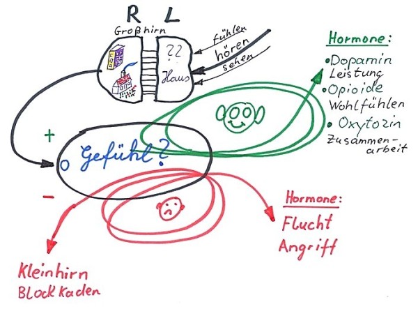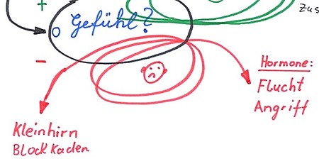 Negative Gefühle aktivieren die Nebennieren. Diese erzeugen Flucht- oder Angriffshormone (Adrenalin oder Noradrenalin). Zusätzlich wird das Kleinhirn aktiv und blockiert das Großhirn (Denkblockaden). Lernen ist schwierig oder sogar unmöglich.