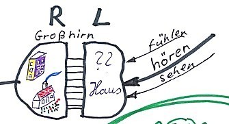 Ein Wort z.B. „Haus“ erreicht die linke Großhirnrinde. Über den Balken wird die rechte gefragt, ob sie zu „Haus“ ein Bild im Speicher hat. Natürlich hat sie ein Bild zu „Haus“, aber bei jedem Menschen ist dieses Bild anders.