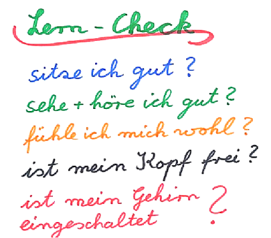 Zu Beginn eines Unterrichts oder einer Seminareinheit sollten sich Alle folgende Fragen stellen um erfolgreiches Lernen zu ermöglichen: