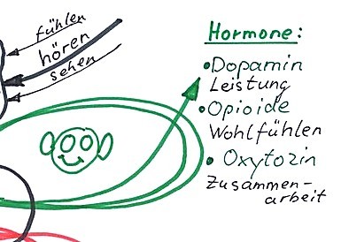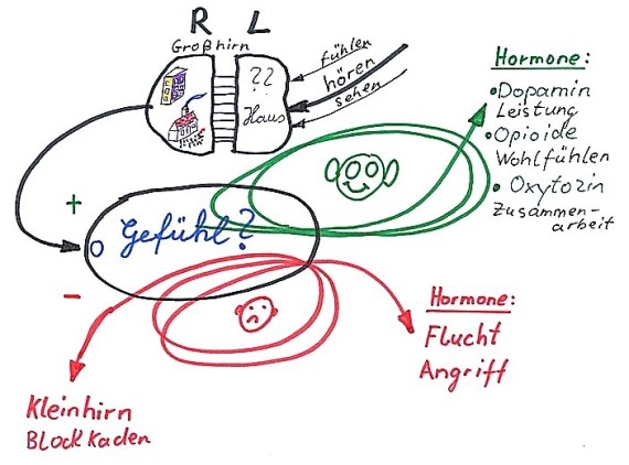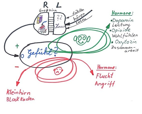 Negative Gefühle aktivieren die Nebennieren. Diese erzeugen Flucht- oder Angriffshormone (Adrenalin oder Noradrenalin). Zusätzlich wird das Kleinhirn aktiv und blockiert das Großhirn (Denkblockaden). Lernen ist schwierig oder sogar unmöglich.