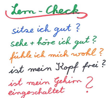 Zu Beginn eines Unterrichts oder einer Seminareinheit sollten sich alle Teilnehmer folgende Fragen stellen um erfolgreiches Lernen zu ermöglichen: