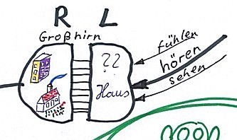Ein Wort z.B. „Haus“ erreicht die linke Großhirnrinde. Über den Balken wird die rechte gefragt, ob sie zu „Haus“ ein Bild im Speicher hat. Natürlich hat sie ein Bild zu „Haus“, aber bei jedem Menschen ist dieses Bild anders.